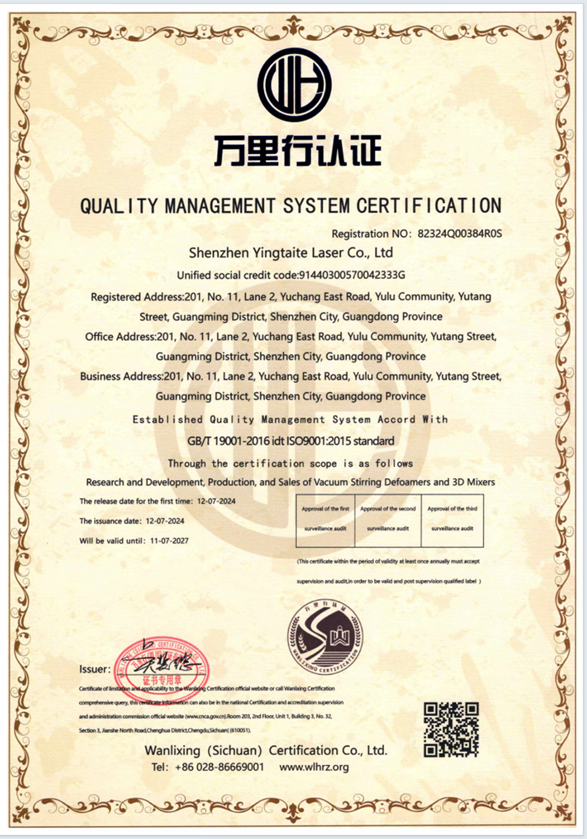 深圳市英泰特激光有限公司是一家有雄厚研發實力的公司,公司是中國領先的行星式攪拌、脫泡機生產廠家。我們圍繞客戶的需求持續創新與研發,在LED光電、銀漿、納米粉體材料、陶瓷粉末、高粘度涂料等高、尖、精領域材料的混合攪拌的解決方案。致力于為材料事業提供最佳的攪拌、脫泡方案。 產品攪拌均勻度、氣泡脫凈度、噪音控制為業界領先水平。同時我們設備優良的工程設計與制造技術,保證了設備的耐久性使用壽命。